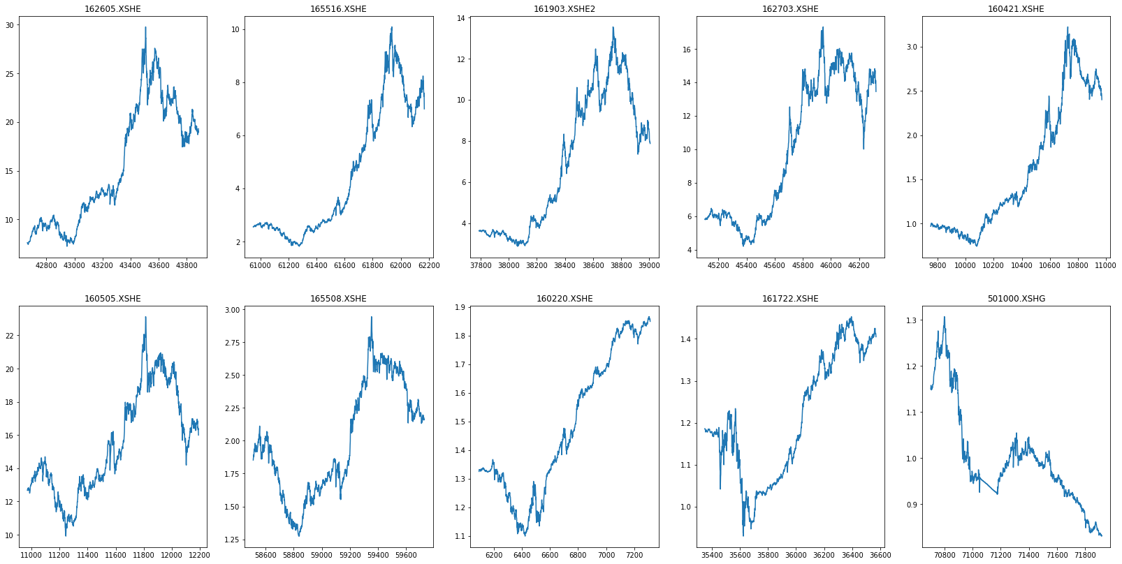 第一行为得分前五名的基金业绩走势图,第二行为后五名的基金业绩走势图。(从走势来看,好像没有什么特别大的差异。)