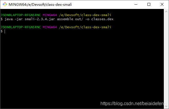 7、运行jar包 smali assemble smali文件夹 -o classes.dex , 得到classes.dex文件