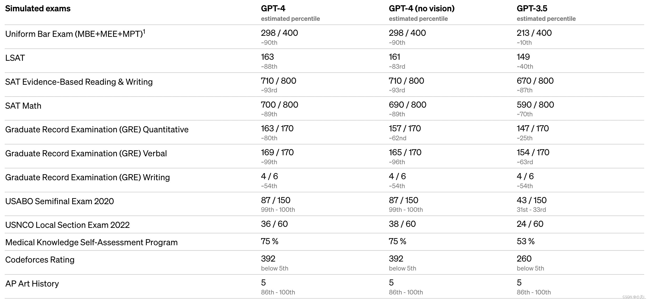 以下是GPT4参加多种专业性考试的得分,考试类型从法律到GRE再到奥赛,基本都是取得了很高的分数,GRE考试甚至取得了169分