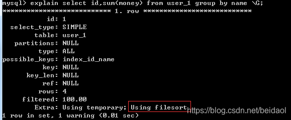 不禁止排序,即不使用ORDER BY NULL时:有明显的Using filesort。