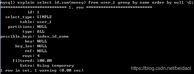 那么就会有这样的情况出现,我们对查询到的结果是否已经排序不在乎时,可以使用ORDER BY NULL禁止排序达到优化目的。下面使用EXPLAIN命令分析SQL。
