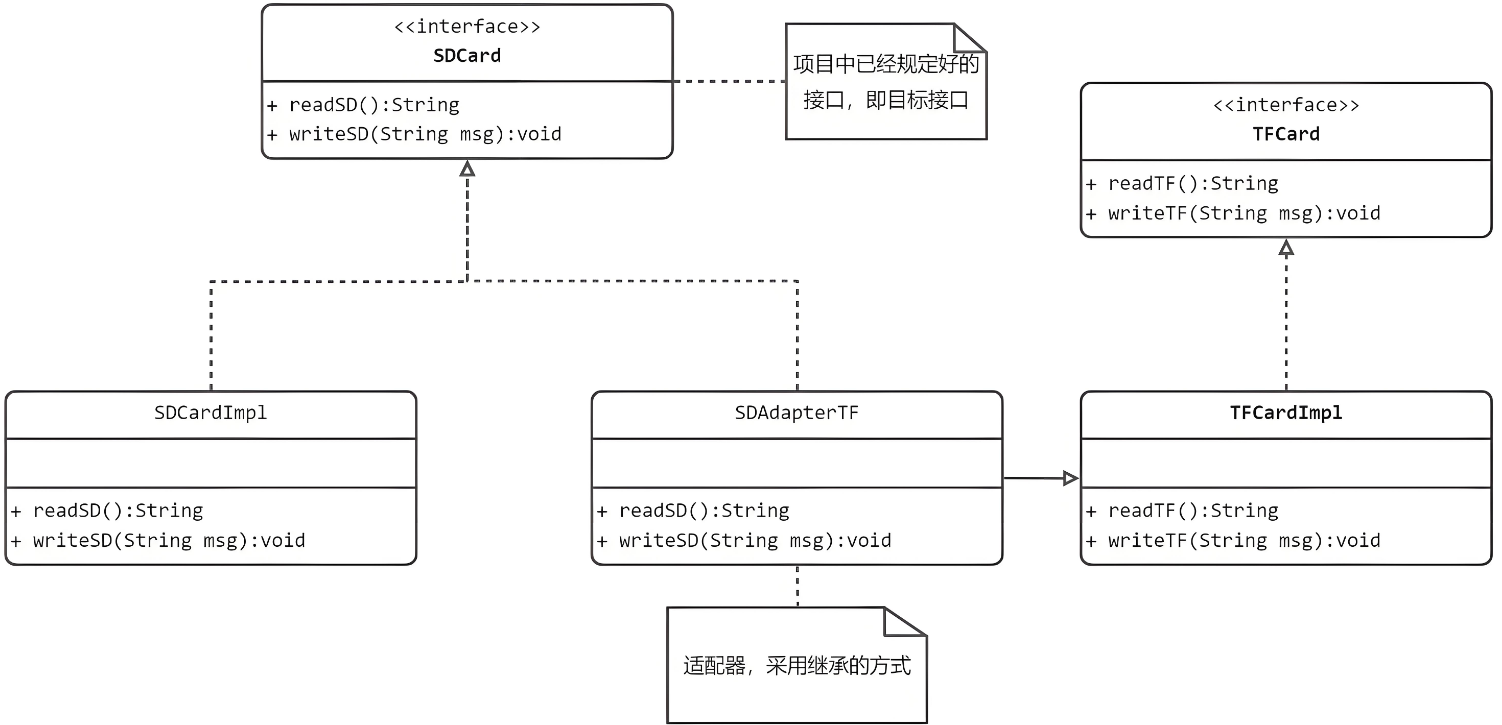 类适配器模式通过继承适配者类并实现目标接口来完成适配。