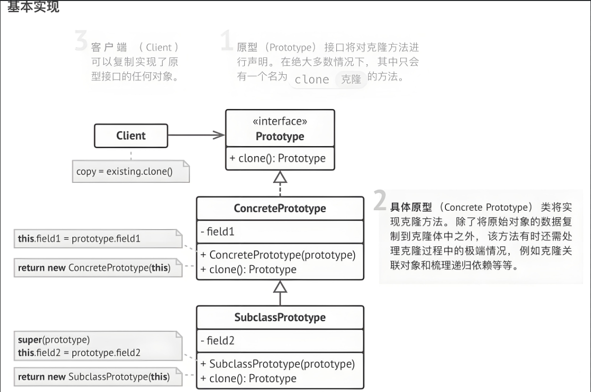 - 原型(Prototype):定义了克隆自身的方法,通常是一个接口或抽象类,包含