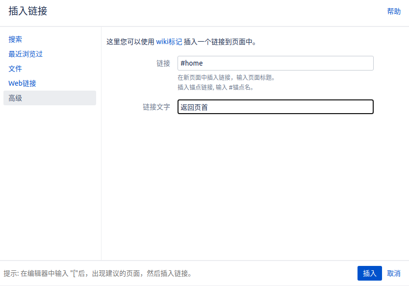 3. 选中需要添加链接到锚点的文字,按CTRL + K会打开插入链接对话框,点高级,在链接框里输入#home,点击插入.