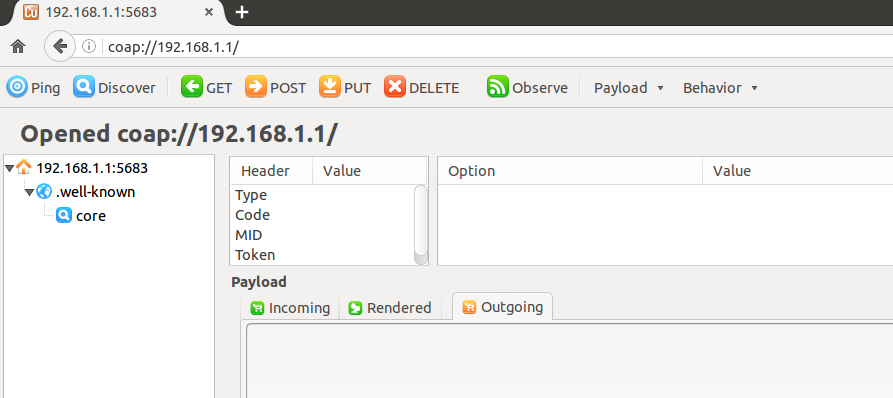在浏览器地址栏输入待测服务器的URL:coap://192.168.1.1/