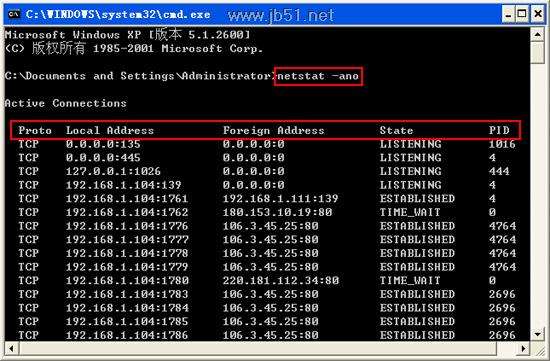 点击电脑左下角的开始,然后选择运行选项,接着我们在弹出的窗口中,输入【cmd】命令,进行命令提示符。然后我们在窗口中输入【netstat -ano】按下回车,即会显示所有的端口占用情况。如图所示: