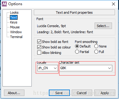 在窗口上右击鼠标,选择[Options]菜单,选择[Text],locale选择:zh_CN,Character set 选择 GBK。