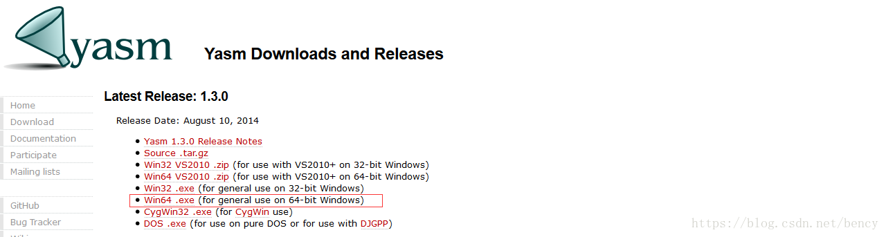 我用的是Win64.exe。下载后,将下载的yasm-1.3.0-win64.exe改名为yasm.exe,并放置于MSYS2 安装目录中。