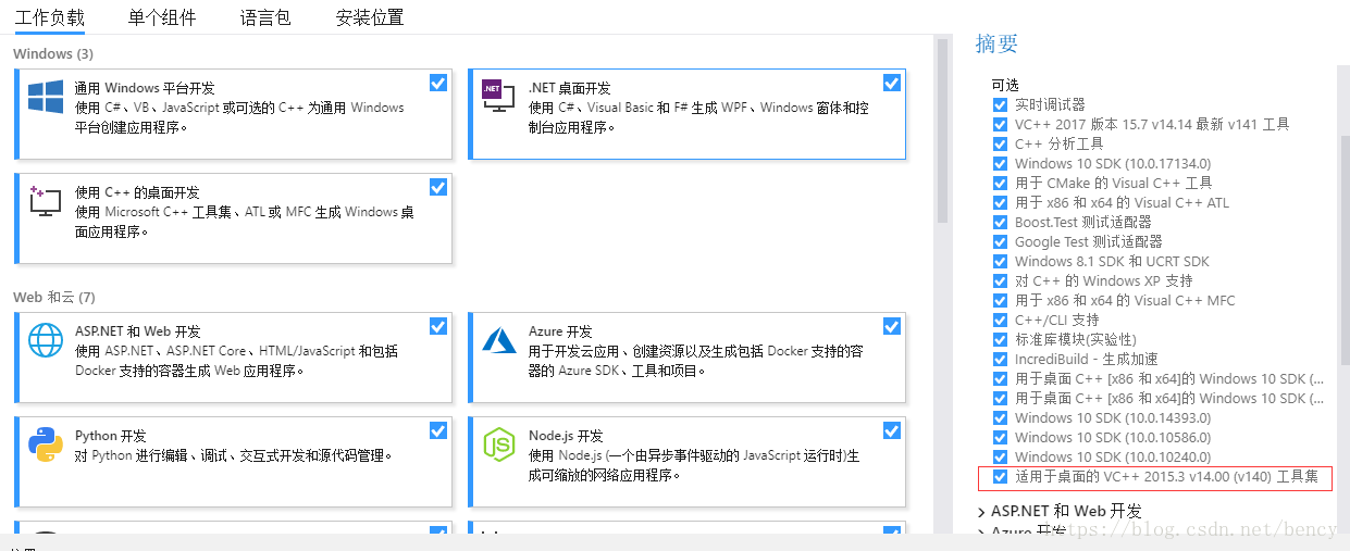 选择【安装VC ++ 2015.3 v140桌面工具集(x86,x64)】,如下图