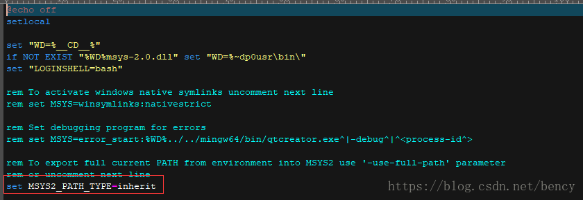 修改MSYS2目录下msys2_shell.cmd中rem set MSYS2_PATH_TYPE=inherit为set MSYS2_PATH_TYPE=inherit
