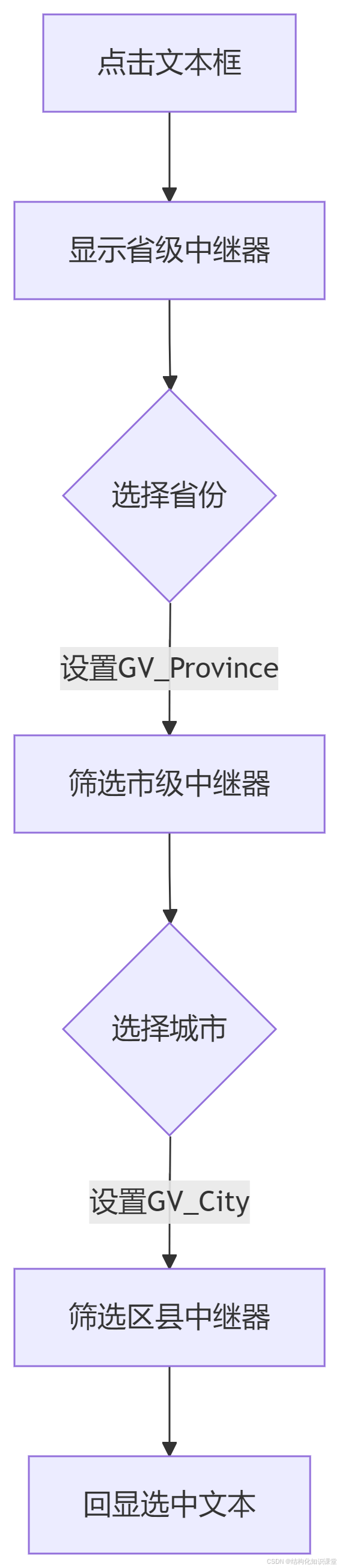 - 区县中继器:存储区县ID、区县名称、所属市ID