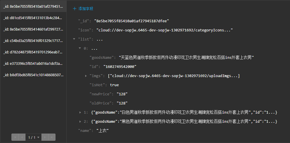 到这里就要用到本程序中最最最复杂的一个数据库集合了,几乎所有的商品数据都是存放在这个集合中的。