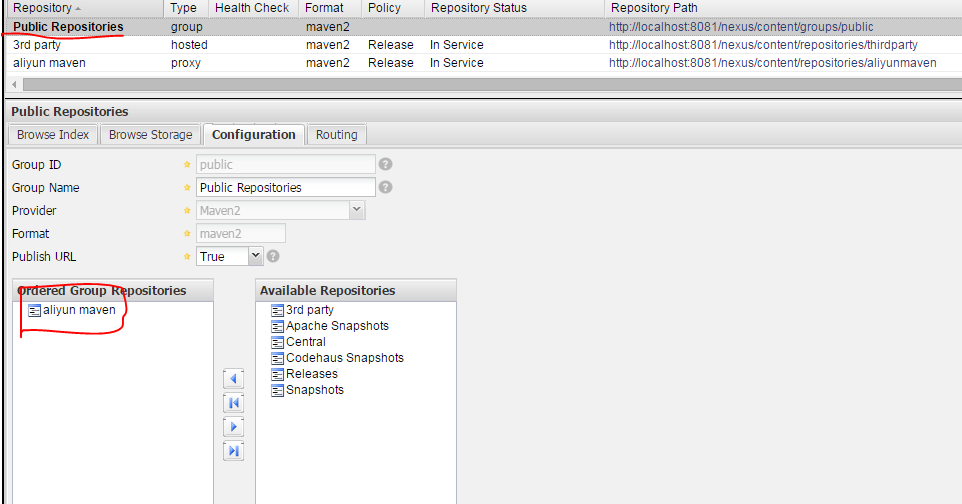 然后是为仓库组增加这个aliyunmaven镜像,保存就ok了