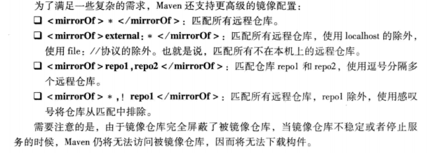 如果仓库X可以提供仓库Y存储的所有内容,那么就可以认为X是Y的一个镜像。换句话说,任何一个可以从仓库Y获得的构件,都能够从它的镜像中获取。