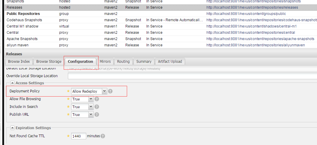 需要注意的是,nexus的release模式默认不允许重复上传,注意修改为如下所示的值