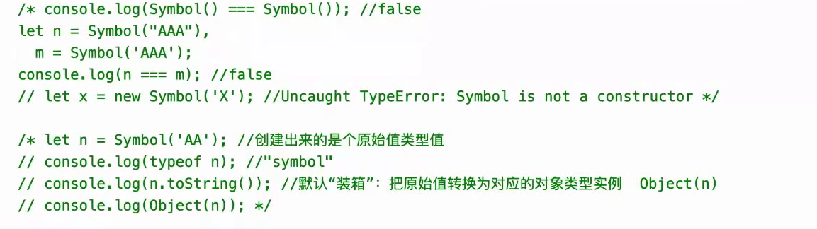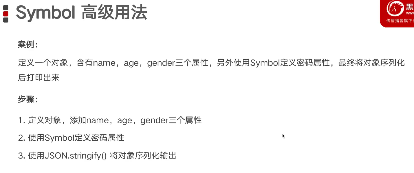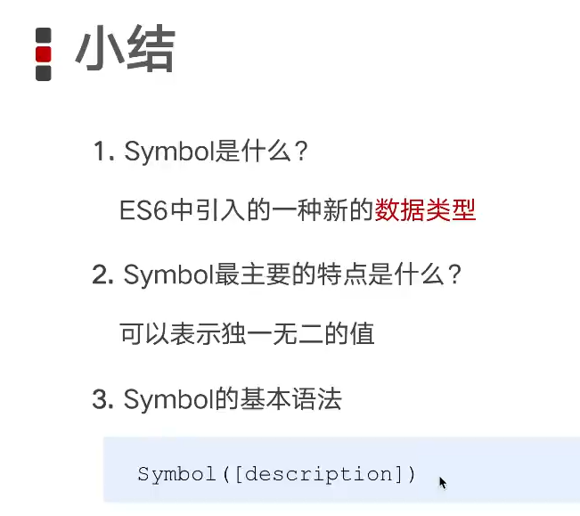 当用symbol去定义对象属性的时候,一定要用中括号 [ ] 语法;(声明、获取、赋值都需要中括号包裹)