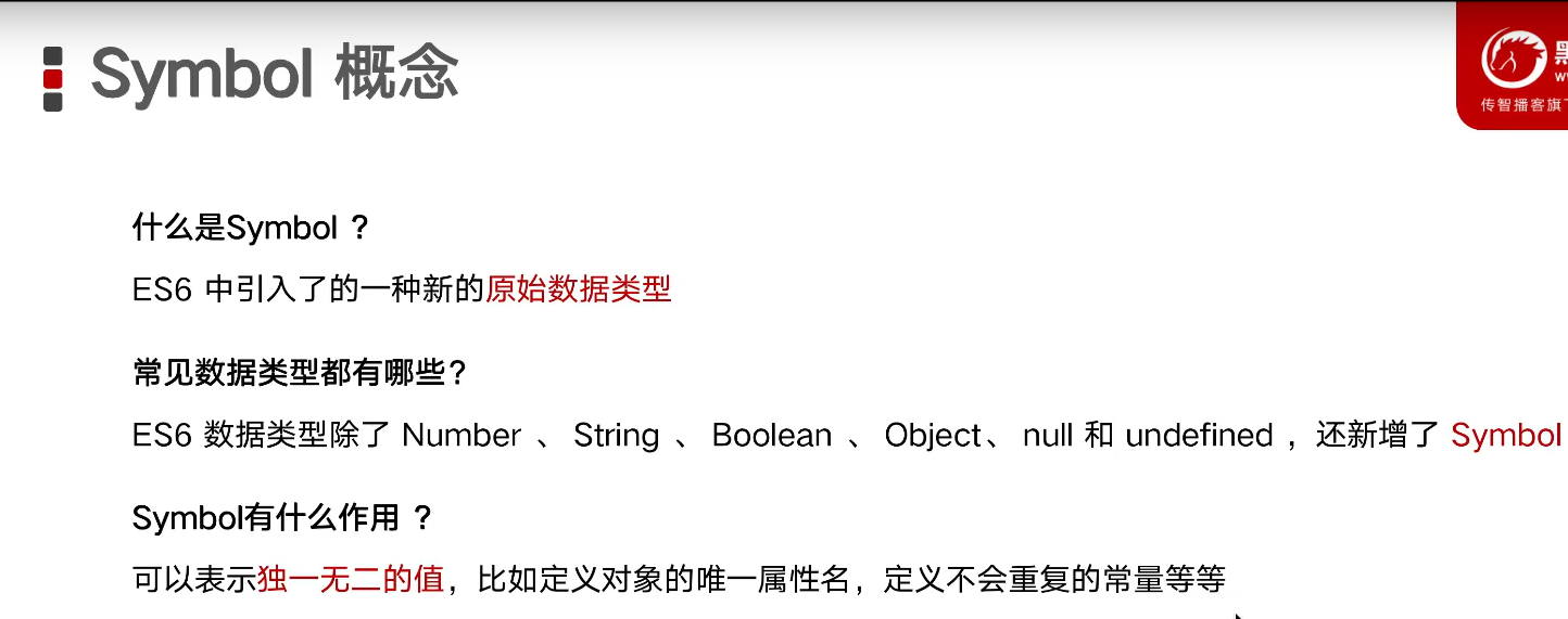 symbol类型表示的是独一无二的值,常用在定义对象的唯一属性名。