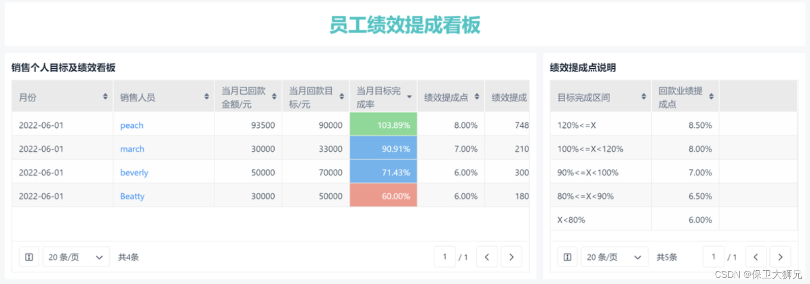 通过绩效看板,可以查看各部门、各成员的回款金额、目标完成情况,并直接计算出各成员每月的绩效提成,掌握员工绩效数据,便于进行人员管理。