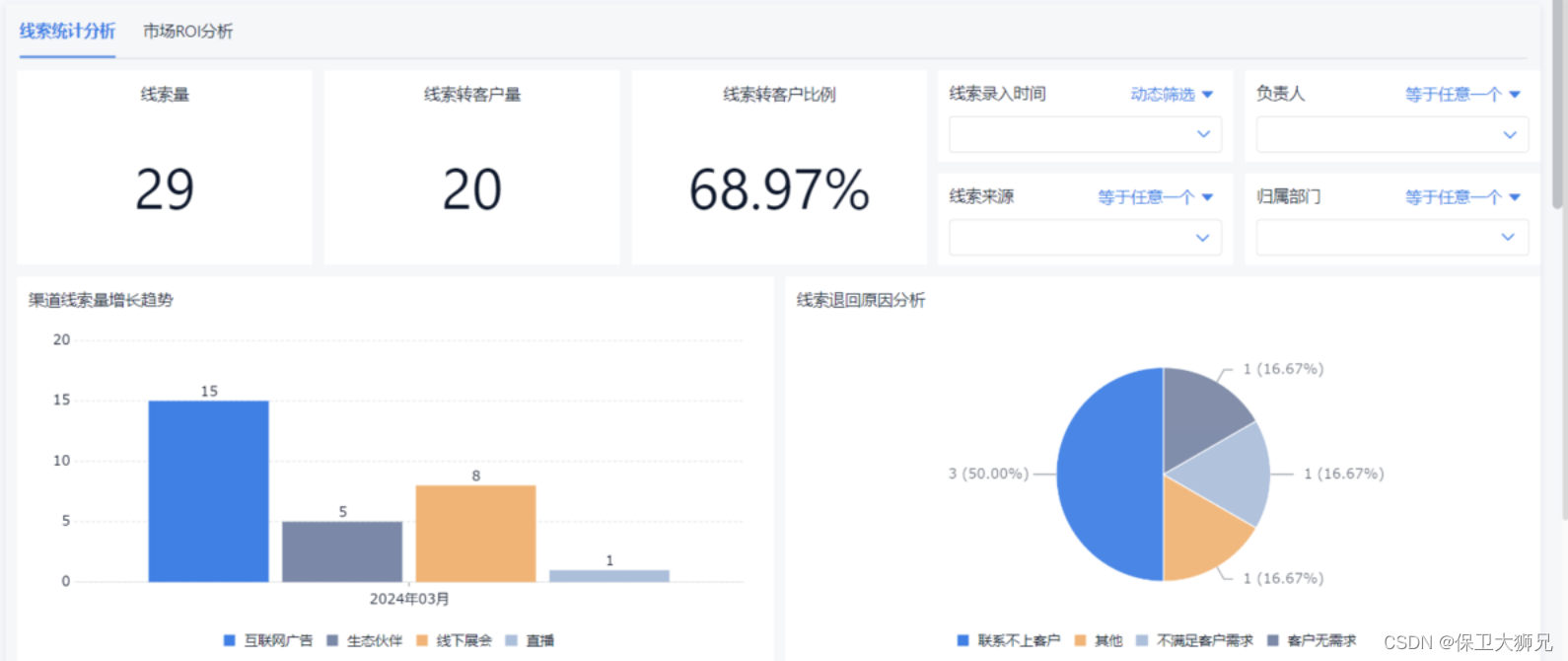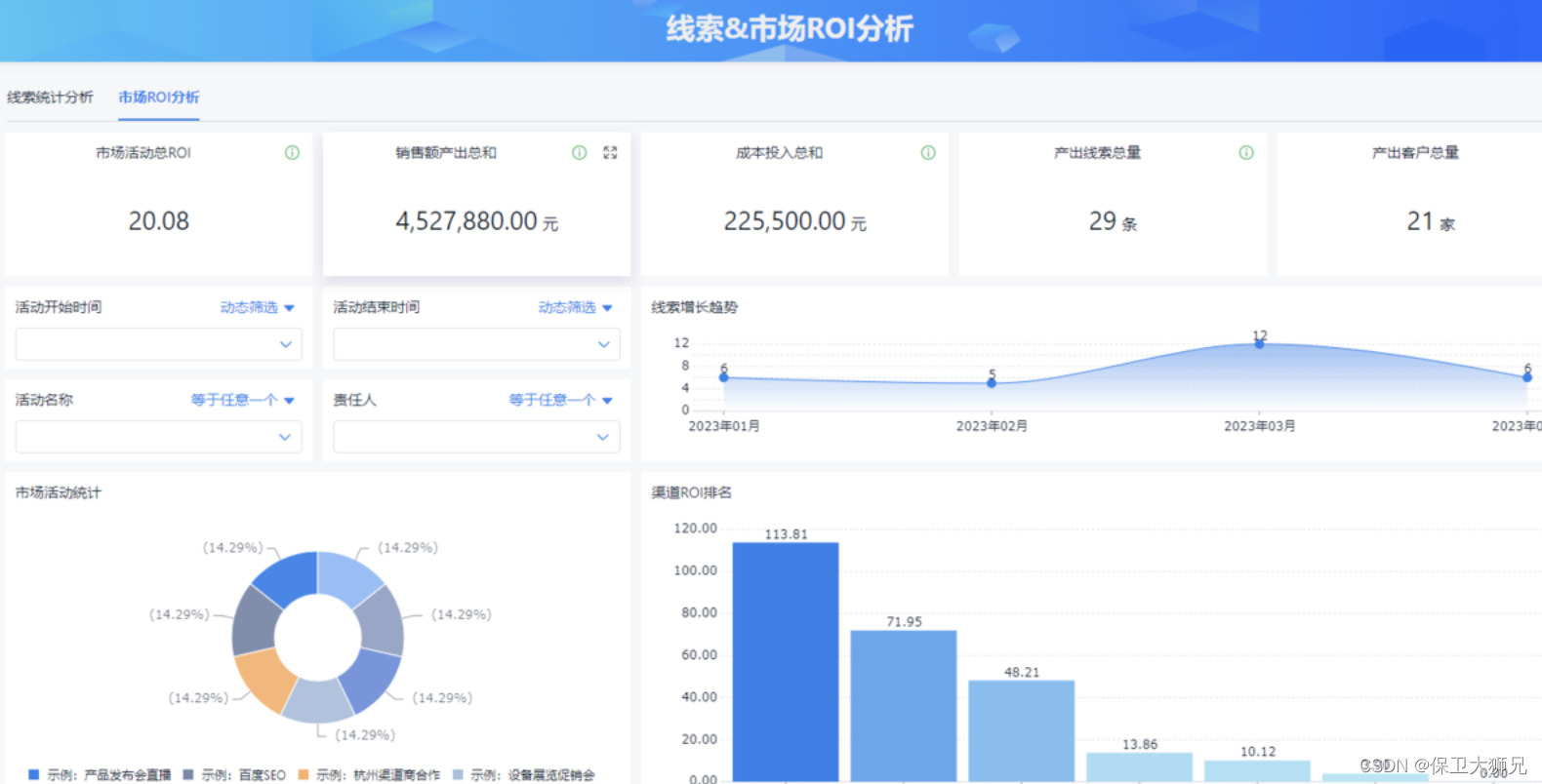 CRM系统可以收集和分析市场营销活动的数据,以评估活动的效果和效率,分析可以包括各种指标,如活动的投资回报率(ROI)、线索转化率、客户增长率、客户参与度等。这些数据可以帮助企业了解哪些营销活动最有效,哪些渠道带来了最多的潜在客户,以及哪些策略需要调整或改进。通过深入的分析,企业可以制定更精准的市场营销策略,提高营销活动的针对性和效果。