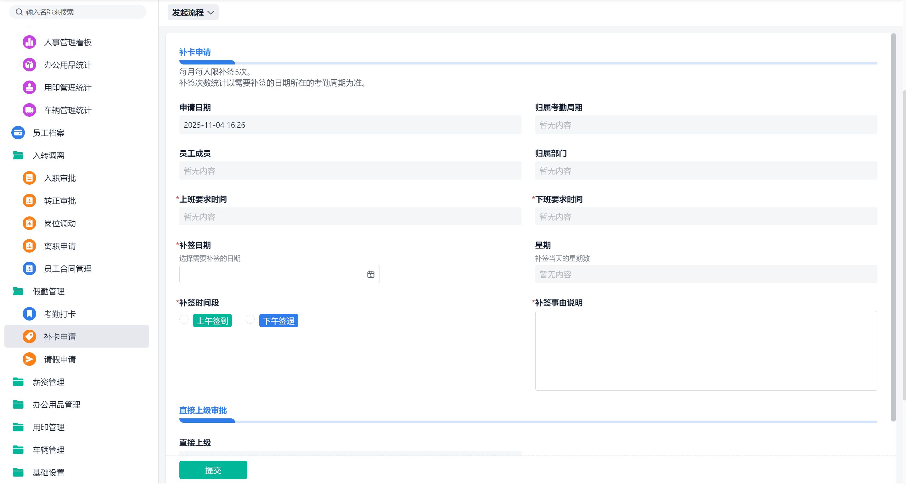 它让员工有一个统一入口,能快速发起审批,能随时打卡签到。
