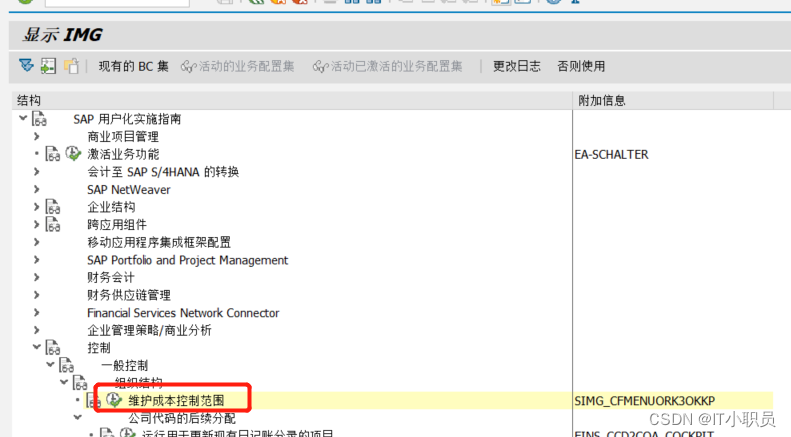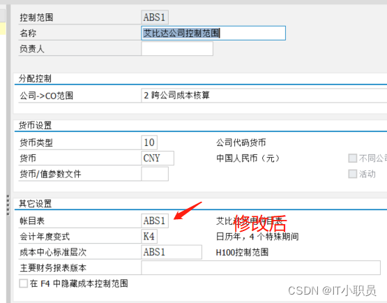- 给成本控制范围ABS1和公司代码ABS1分配相同的科目表。使用配置进行此操作。