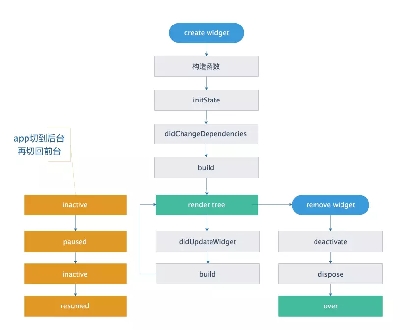 dispose()当 State 被永久的从视图树中移除,Framework 会调用该函数。在销毁前触发,我们可以在这里进行最终的资源释放。在调用这个函数之前,总会先调用 deactivate()。⚠️注意,重写的时候必须要调用 super.dispose()。