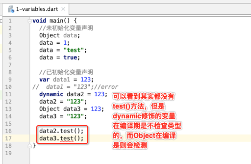 是Dart 对象的基类,当你定义: object o =xxx ;时这个时候系统会认为o 十个对象,你可以调用o的toString()和hashCode()方法因为Object 提供了这些方法,但是如果你尝试调用o.foo()时,静态类型检查会运行报错。综上不难看出dynamic 与object 的最大的区别是在静态类型检查上。