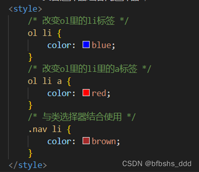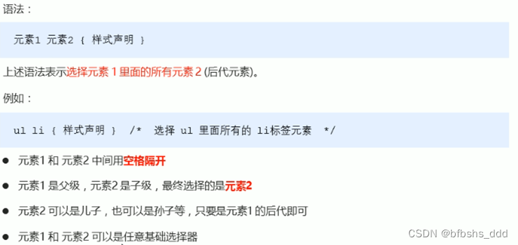 又称为包含选择器,可以选择父元素里的子元素,外层标签写在前面,内岑标签写在后面,中间用空格分隔。当标签发生嵌套时,内层标签就成为外层标签的后代