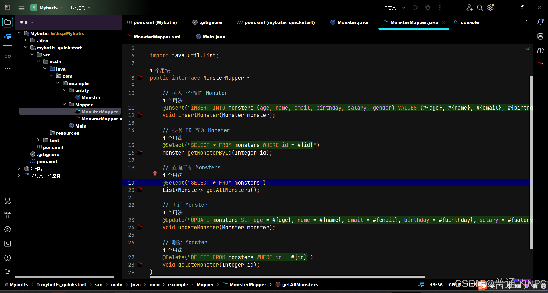 对应文件下面添加一个MonsterMapper.xml文件进行配置SQL语句: