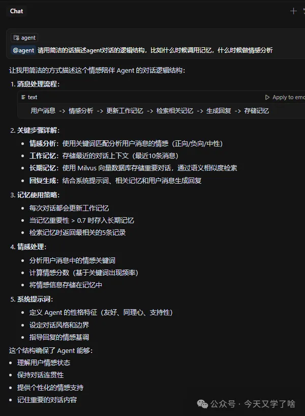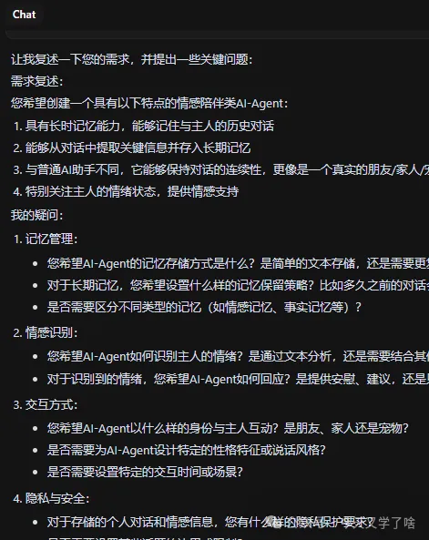 确实实现了一个AI-Agent并调用了向量数据库(但是似乎要聊很多次才能触发长期记忆),LLM用的kimi的moonshot-v1-8k,对话看起来似乎不是很聪明的样子。作为一个APP还有很多可以优化的地方,不过今天就到这里吧~