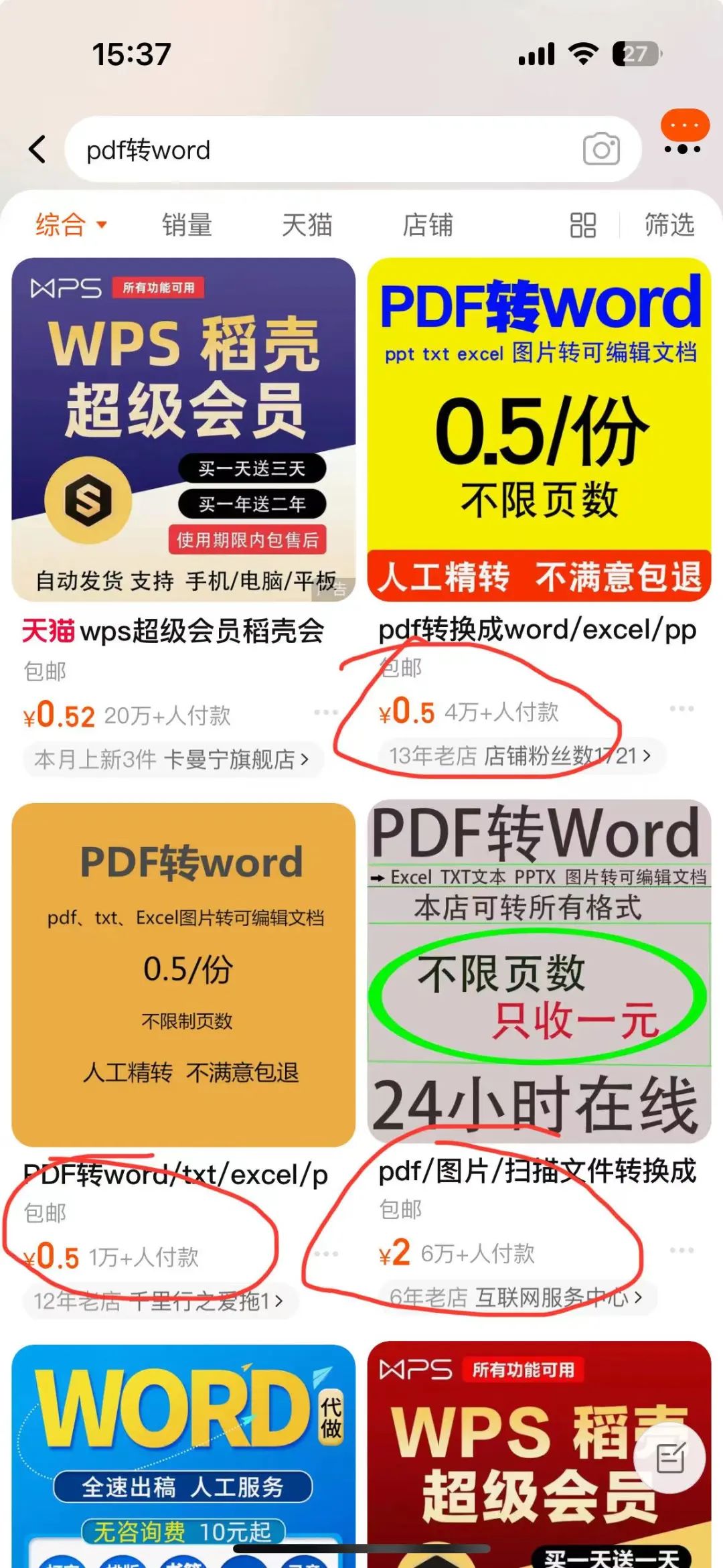 搜索了一下关键词 “pdf转word” ,瞬间惊呆了,这种小功能竟然需求量这么大,都是几万人付款: