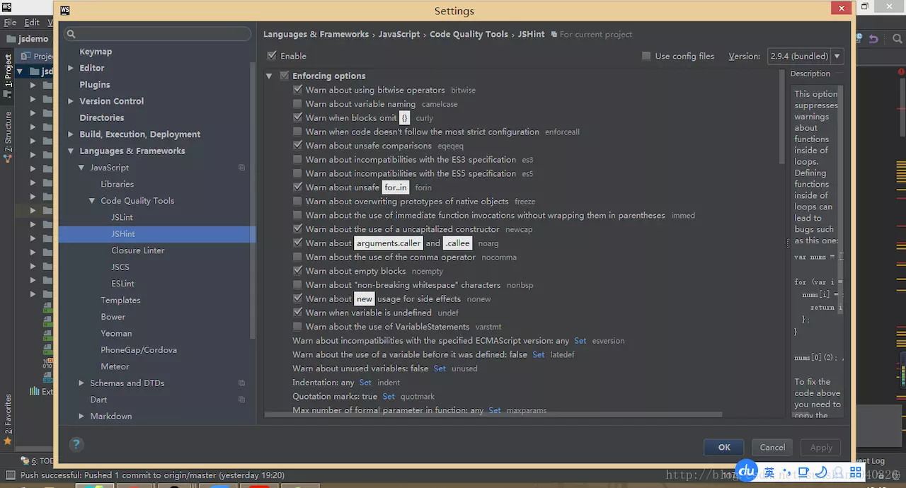 在js规范中,有很多规范都是样式上的规范而不是逻辑上的规范,比如尽量使用===而不是==,我们可以使用JSHint或者JSLint,Javascript代码验证工具,这种工具可以检查你的代码并提供相关的代码改进意见。我个人使用的是JSHint,所以就以这个为例