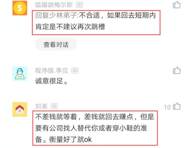 不过对程序员来说,如果你回到了原公司,一方面是稍微有点尴尬,毕竟同事都知道你辞职了,现在又回来了,他们会怎么想呢。另外一方是你真的回去了,短时间内肯定是不适合再跳槽了,毕竟频繁跳槽之后,你就更不好找工作了。