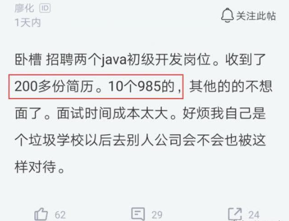 最近在职场论上看到这样一个帖子:公司招2个初级程序员,隔天HR却收到200份简历,其中有10个是985名校都来了,看完简历蒙了!这是怎么回事呢?