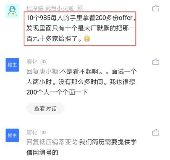 当时这个HR说由于时间关系,自己只想面试这10个985的,至于其他190多份学历没那么高的员工只能放弃了。但同事这个员工也感叹:自己学校也很差,会不会以后找工作也会被这样对待呢,连个面试机会都不给。