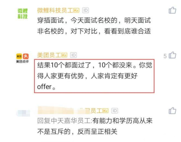 还有网友说学历与能力其实关系并不是很大,你这么做也不太好。你完全可以选择更好的方式,比如穿插面试,今天面试985的,明天面试非名校的,只有经过对比,你才能够找到更合适的员工。而且并不是说一定要招能力最强的,这种人一般都不会很稳定,也不一定会入职,你必须招最合适的员工才对。
