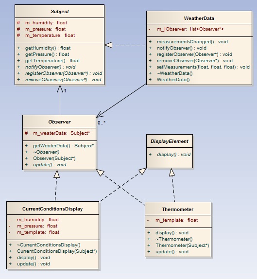 #include <iostream> #include <list> #include <string> #include <algorithm> using namespace std; class Observer; // 主题 class Subject { public: virtual void registerObserver(Observer* o) = 0; virtual void removeObserver(Observer* o) = 0; virtual void notifyObserver() = 0; float getTemperature(); float getHumidity(); float getPressure(); protected: float m_temperature; float m_humidity; float m_pressure; }; // 观察者 class Observer { public: Observer(Subject* pWeaterData); virtual ~Observer() {}; virtual void update() = 0; Subject* getWeaterData(); protected: Subject* m_weaterData; }; class DisplayElement { public: virtual void display() = 0; }; class WeatherData:public Subject { public: WeatherData(); ~WeatherData(); void registerObserver(Observer* o); void removeObserver(Observer* o); void notifyObserver(); void measurementsChanged(); void setMeasurements(float temperature, float humidity, float pressure); private: list<Observer*> m_lObserver; }; // 当前条件显示 class CurrentConditionsDisplay:public Observer,public DisplayElement { public: CurrentConditionsDisplay(Subject* pWeaterData); ~CurrentConditionsDisplay(); void update(); void display(); private: float m_template; // 温度 float m_humidity; // 湿度 float m_pressure; // 气压 }; // 温度计 class Thermometer:public Observer,public DisplayElement { public: Thermometer(Subject* pWeaterData); ~Thermometer(); void update(); void display(); private: float m_template; // 温度 }; float Subject::getTemperature() { return m_temperature; } float Subject::getHumidity() { return m_humidity; } float Subject::getPressure() { return m_pressure; } Observer::Observer(Subject* pWeaterData) { m_weaterData = pWeaterData; } Subject* Observer::getWeaterData() { return m_weaterData; } WeatherData::WeatherData() { m_temperature = 0; m_humidity = 0; m_pressure = 0; } WeatherData::~WeatherData() { list<Observer*>::iterator iter, temp; for (iter=m_lObserver.begin(); iter!=m_lObserver.end(); ++iter) { delete (*iter); } m_lObserver.clear(); } void WeatherData::registerObserver(Observer* o) { m_lObserver.push_back(o); } void WeatherData::removeObserver(Observer* o) { list<Observer*>::iterator iter; iter = std::find(m_lObserver.begin(), m_lObserver.end(), o); if (m_lObserver.end() != iter) { m_lObserver.erase(iter); } } void WeatherData::notifyObserver() { list<Observer*>::iterator iter; for (iter=m_lObserver.begin(); iter!=m_lObserver.end(); ++iter) { (*iter)->update(); } } void WeatherData::measurementsChanged() { notifyObserver(); } void WeatherData::setMeasurements(float temperature, float humidity, float pressure) { m_temperature = temperature; m_humidity = humidity; m_pressure = pressure; measurementsChanged(); } CurrentConditionsDisplay::CurrentConditionsDisplay(Subject* pWeaterData):Observer(pWeaterData) { pWeaterData->registerObserver(this); } CurrentConditionsDisplay::~CurrentConditionsDisplay() { m_weaterData = NULL; } void CurrentConditionsDisplay::update() { m_template = m_weaterData->getTemperature(); m_humidity = m_weaterData->getHumidity(); m_pressure = m_weaterData->getPressure(); display(); } void CurrentConditionsDisplay::display() { printf("Current conditions %f0.2F degrees and %0.2f%s humidity and pressure %0.2f\n",m_template,m_humidity,"%",m_pressure); } Thermometer::Thermometer(Subject* pWeaterData):Observer(pWeaterData) { pWeaterData->registerObserver(this); } Thermometer::~Thermometer() { m_weaterData = NULL; } void Thermometer::update() { m_template = m_weaterData->getTemperature(); display(); } void Thermometer::display() { printf("Current conditions %f0.2F degrees\n",m_template); } int main() { WeatherData* pWeatherData = new WeatherData(); CurrentConditionsDisplay* pCurrentConditionsDisplay = new CurrentConditionsDisplay(pWeatherData); Thermometer* pThermometer = new Thermometer(pWeatherData); pWeatherData->setMeasurements(123,456,789); // 当移除观察者后,需要手动释放内存 pCurrentConditionsDisplay->getWeaterData()->removeObserver(pCurrentConditionsDisplay); pWeatherData->setMeasurements(789,456,123); // 当再次注册后,内存交由主题管理 pCurrentConditionsDisplay->getWeaterData()->registerObserver(pCurrentConditionsDisplay); pWeatherData->setMeasurements(135,257,479); delete pWeatherData; return 0; }