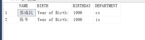 SELECT Sname NAME,'Year of Birth:' BIRTH, 2014-Sage BIRTHDAY,LOWER(Sdept) DEPARTMENT FROM Student;