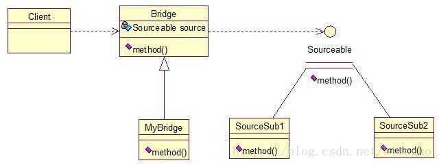 这样,就通过对Bridge类的调用,实现了对接口Sourceable的实现类SourceSub1和SourceSub2的调用。接下来我再画个图,大家就应该明白了,因为这个图是我们JDBC连接的原理,有数据库学习基础的,一结合就都懂了。
