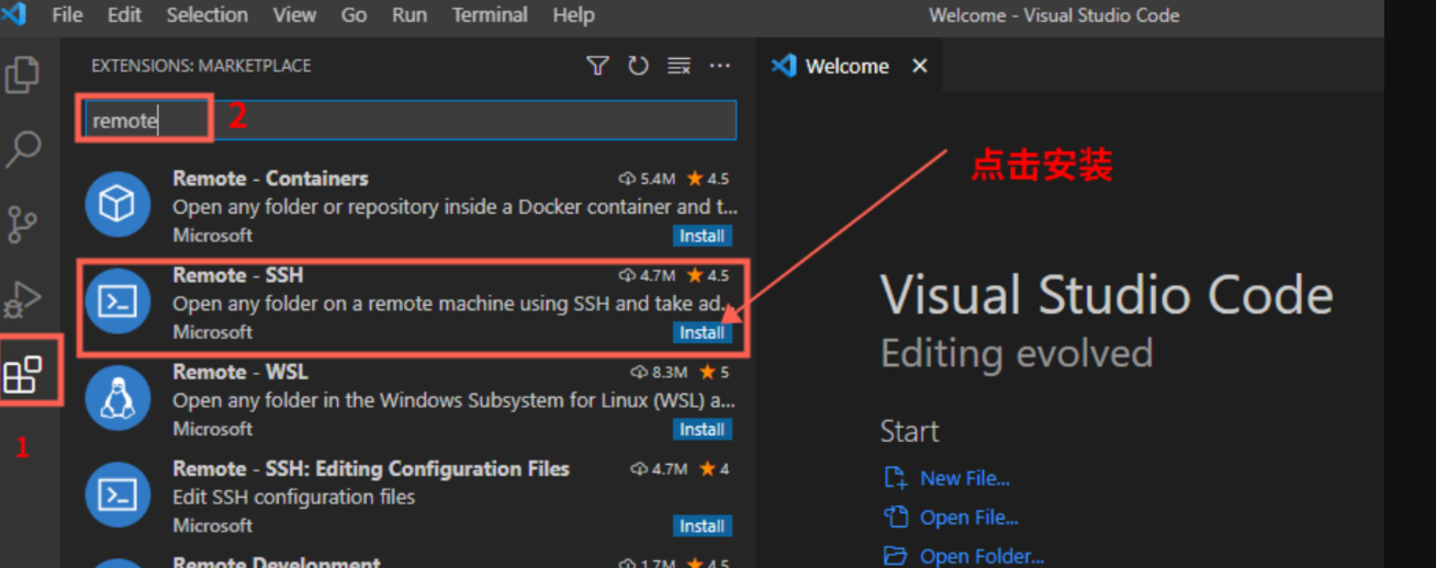 根据你的操作系统选择对应的版本进行下载和安装。 安装完成之后,启动vscode,选择左侧Extensions 选项卡,在输入框搜索 remote ,选择安装Remote-SSH插件。