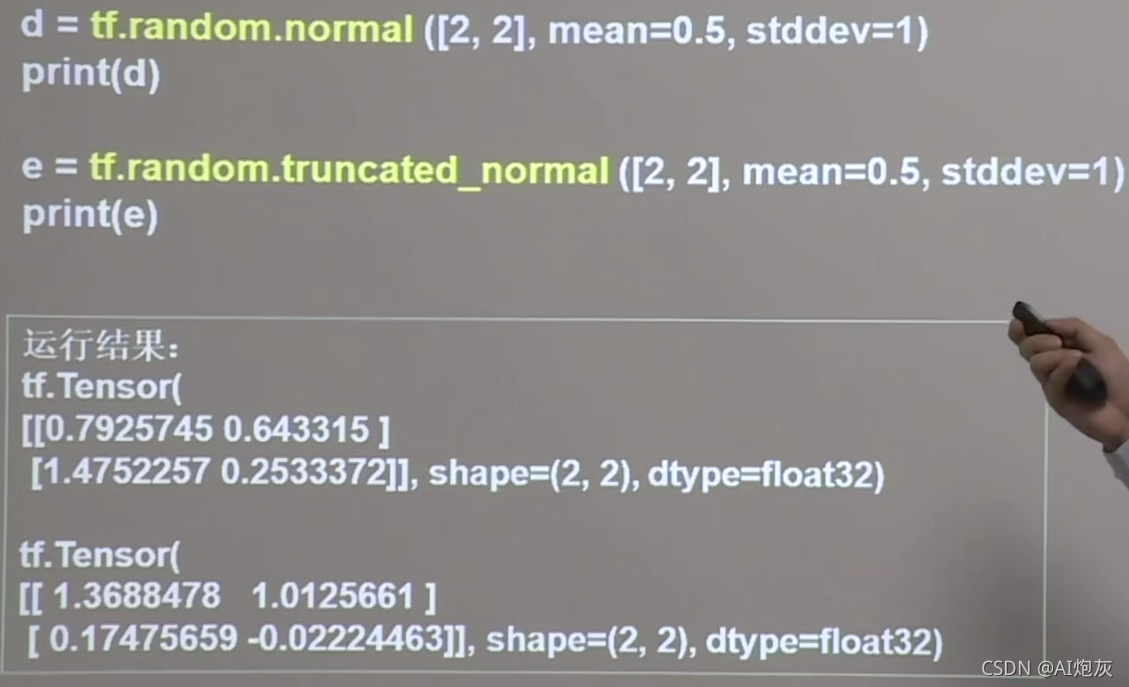 - 生成截断式正态分布的随机数。(维度,mean=均值,stddev=标准差):可以随机生成比较集中点的随机数,可以生成的数据在(均值+-2倍标准差之内)
