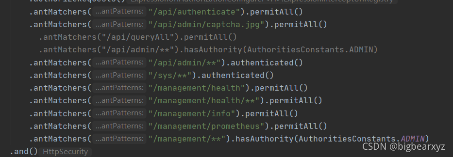 这些配置文件返回一个集合,如果请求的路径不在这个集合中,那么即使有SS也是可以无限制访问后台的;如果在集合中,则会根据集合的配置来判断这个请求是否有访问权限。