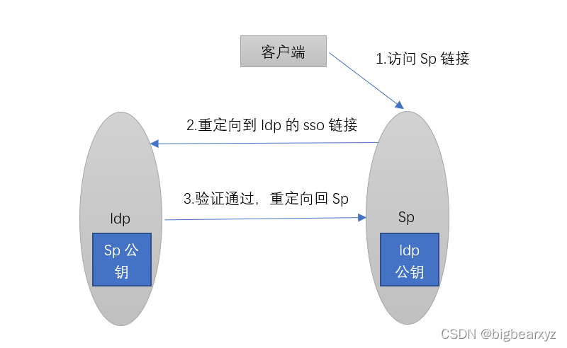 当在客户端输入Sp的url地址,Sp会通过后台重定向到Idp提供的sso地址去进行请求,由于Sp提前保存了Idp的公钥信息,可以顺利的访问到Idp提供的认证地址,在Idp接收到Sp的正常请求后,又会跳转到提前保存好的Sp指定url,同样也由于Idp保存了Sp的公钥信息,可以使得访问顺利进行。