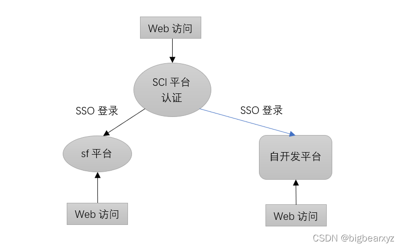 通过上图可以看出,目前的自开发和sf平台是都支持独立的Web访问的,但是sf平台可以通过单点登录(SSO)的方式,纳入到SCI平台的生态系统中,如果公司还有别的项目也采用了SCI认证,那么只要登录了SCI平台,就可以实现真正意义上的一处登录,处处登录。
