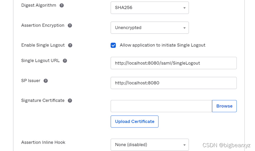 - 在Idp服务器完成SSO验证以后,需要再跳转到Sp服务器,此时需要把Sp服务器中的公钥文件上传到OKTA平台上,不然Idp无法访问Sp服务器,具体上传地方如下:
