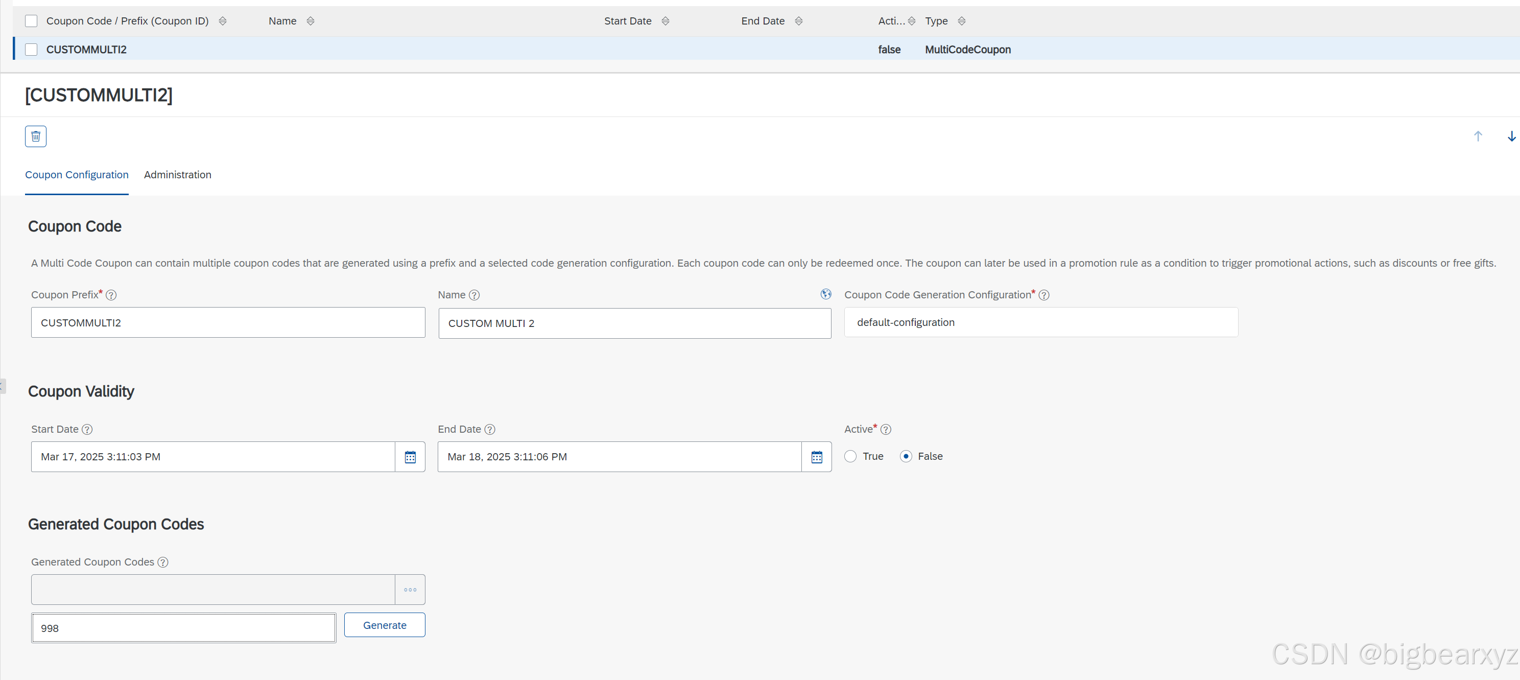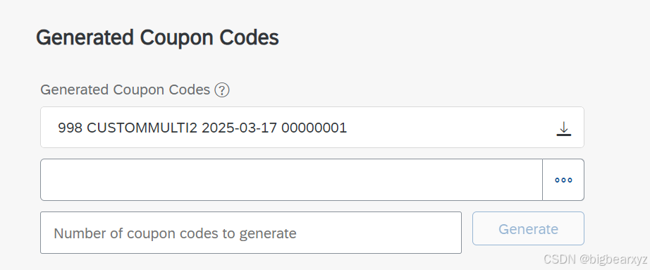 选中新建的优惠券,设置一系列信息后,点击Generate按钮,生成指定数量的优惠券: