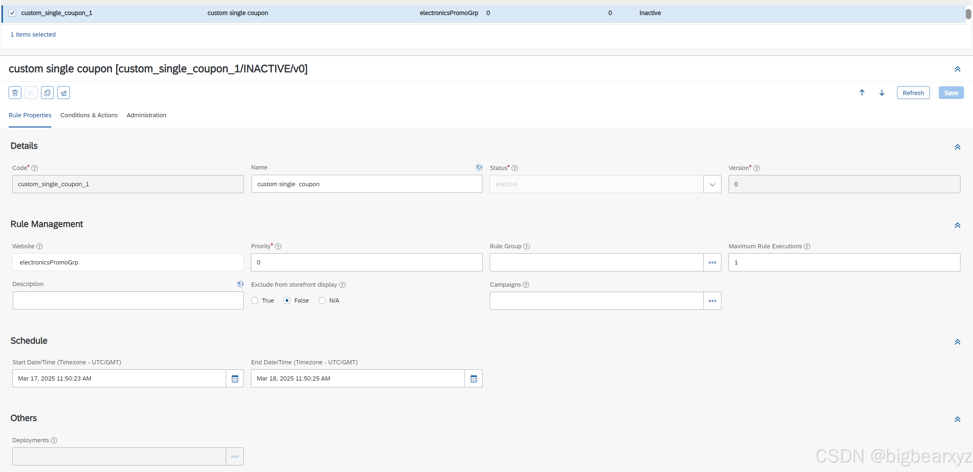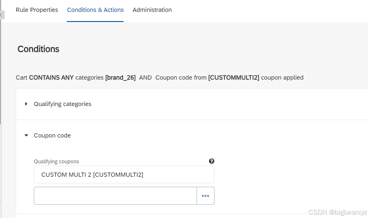 这里,我们使用同一条营销规则,仅仅在Condisions,直接把消费券code换成刚才新建的多个消费券