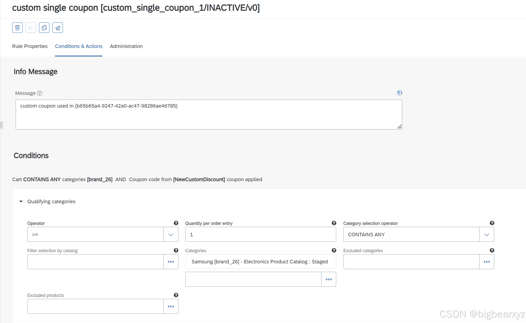 选择好需要生效的Website后,进入Conditions & Actions页面,先设置Message和应用消费券的商品,这里选择只要是三星的商品都可以使用:
