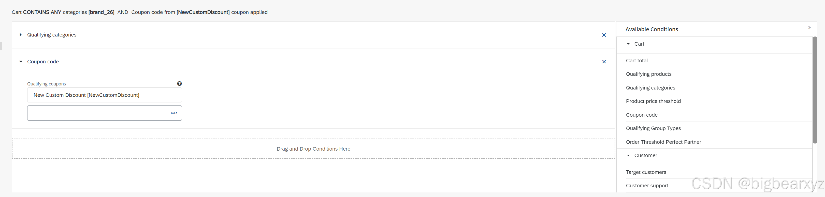 把Available Conditions中的Coupon Code拖到左边的筛选条件中,选择我们新建的单个优惠券