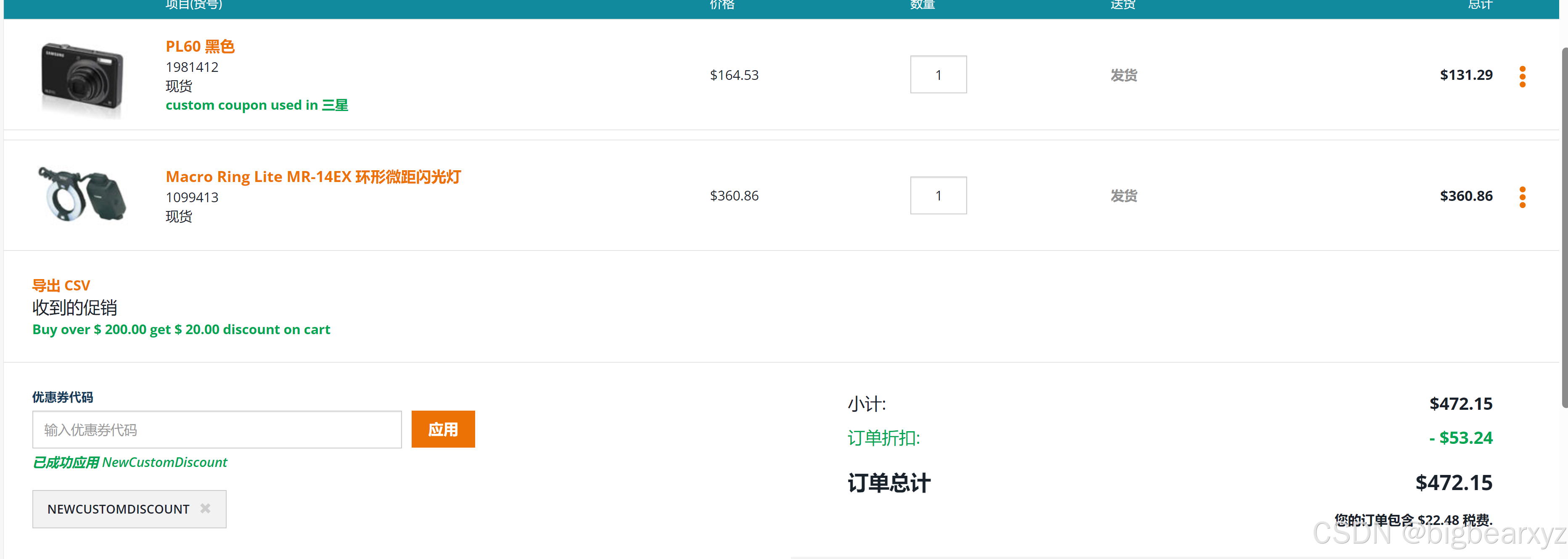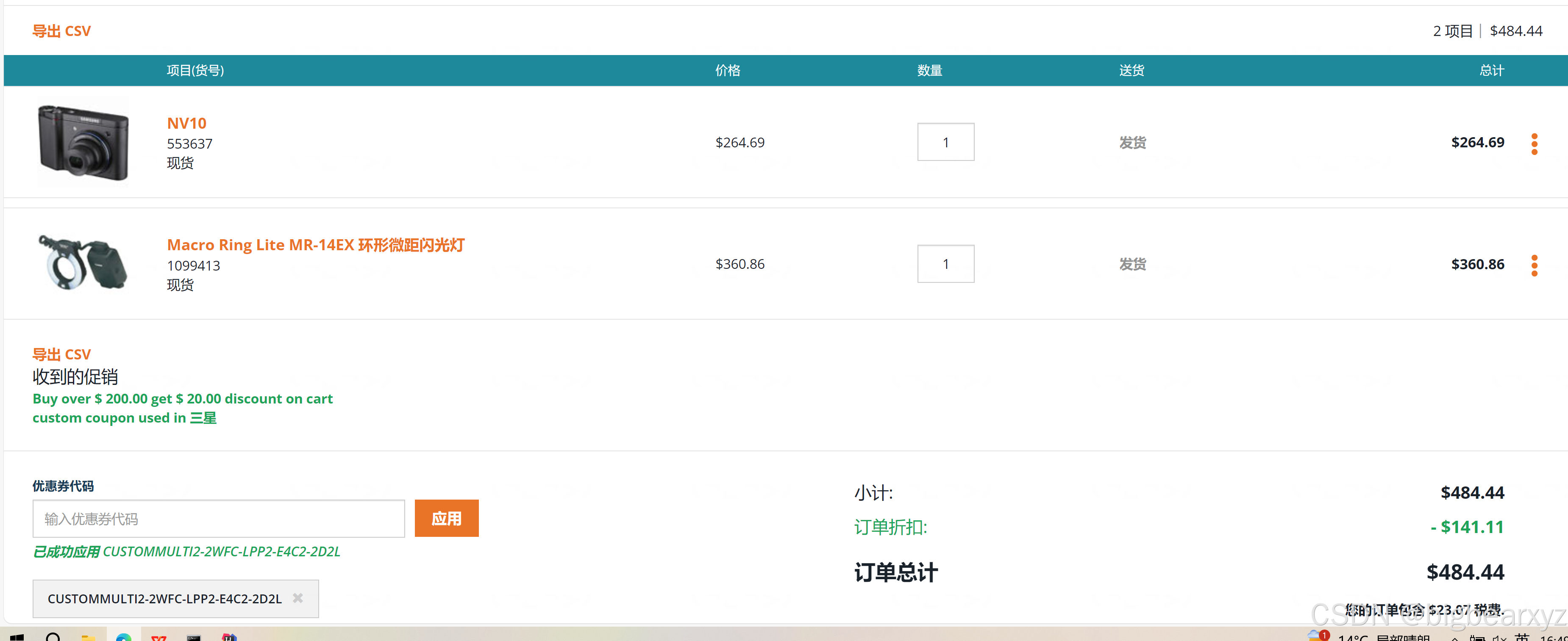 使用上次导出的excel文件,选择第998条优惠券code,在前台结算页面,输入优惠券信息,可以看到原本优惠20美元的商品,在使用优惠券后,优惠了141美元,说明多个优惠券已生效。